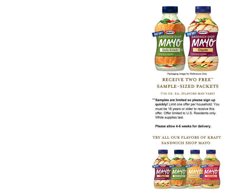 We just got these samples in the mail last week and they're available again! A couple of samples of new mayo flavors. We received 2 and The Hubs thought they were quite yummy. Follow this link: Mayo Samples